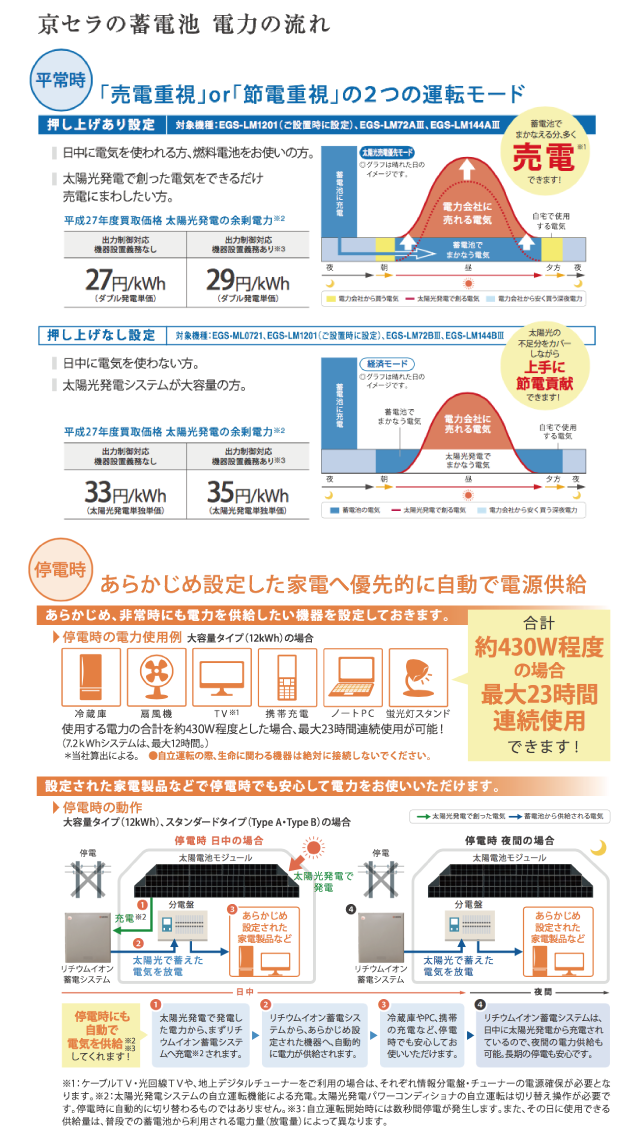 ※3:実際に使用できる容量は、EGS-LM1201では、放電深度92%、電力変換効率94%となり、初期値での蓄電システムとしての最大使用可能容量の目安は、10.4kWhとなります。EGS-ML0721、EGS-ML72AⅢ(BⅢ)、EGS-LM144AⅢ(BⅢ)、では、放電深度80%と電力変換効率94%をかけた値となり、初期値での蓄電システムとしての最大使用可能容量の目安はEGS-ML0721およびEGS-ML72AⅢ(BⅢ)はやく5.4kWh、EGS-LM144AⅢ(BⅢ)はやく10.8kWhとなります。周辺温度やお客様宅での消費電力量により電力変換効率が下がる場合があります。